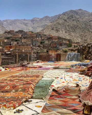 Avec un départ matinal de Marrakech pour une agréable route vers le sud, serpentant à travers les gorges de Moulay Brahim et les vallées supérieures pour arriver aux contreforts élevés du Haut Atlas occidental. Notre point de départ, Imi Oughlad (1450 m), se trouve face au Jbel Toubkal, le plus haut sommet d’Afrique du Nord avec ses 4167 m, ainsi qu’Aglzim (3650 m) et Aksoual (3847 m) qui se dressent devant nous. Ici, nous descendons de notre véhicule et faisons la rencontre de notre équipe de muletiers berbères, un moment toujours convivial lors de nos randonnées. Nous partons ensuite en direction nord-ouest pour une randonnée d’acclimatation de 2 heures sur des sentiers en lacets empruntés par les muletiers, en passant par des champs de maïs, des forêts de pins et de genévriers, jusqu’au Tizi n’Tachete (2000 m), où nous ferons une pause pour admirer la vue sur les vallées d’Imlil et d’Aït Oussaden. Nous poursuivrons ensuite pendant une demi-heure jusqu’à Imi n’Ifri pour notre pique-nique champêtre. Puis, une marche lente d’environ 2 heures et demie en direction du sud-ouest le long d’une piste en terre jusqu’à l’Assif n’Aït Oussaden et le village en terrasses d’argile rouge de Tiziane (1750 m), où nous passerons la nuit en gîte d’étape ou bivouac.