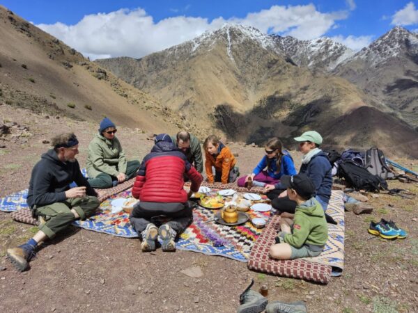 Aujourd’hui est une journée d’acclimatation prévue. Nous partons tôt le matin, et notre objectif du jour est le sommet de l’Aglzim (3500 m). Une fois au sommet, nous aurons le temps de profiter de la vue imprenable sur le Haut Atlas avant de commencer notre descente vers le camp. Nous arriverons enfin au camp (3206 m) dans la vallée de Mizane, au pied du mont Toubkal, en fin d’après-midi, après 7 heures de marche.